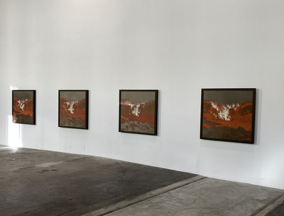105 × 105 cm, Schwefel- und Goldschwefel mit Acrylbinder auf Basaltgewebe, auf MDF und Holz, gerahmt